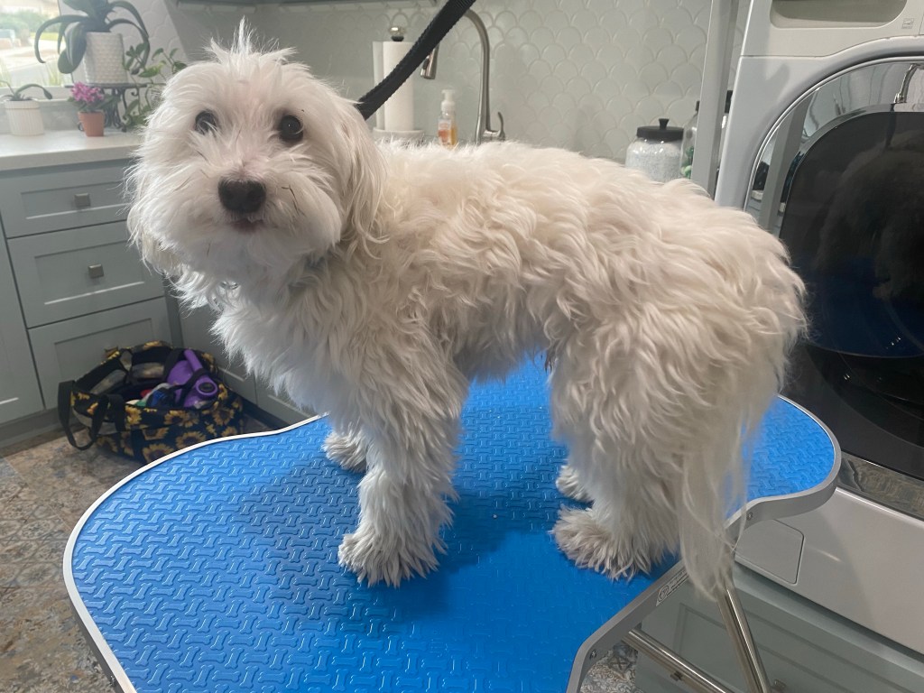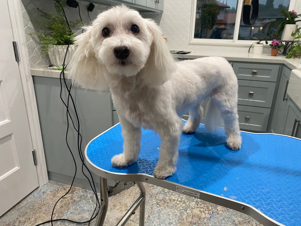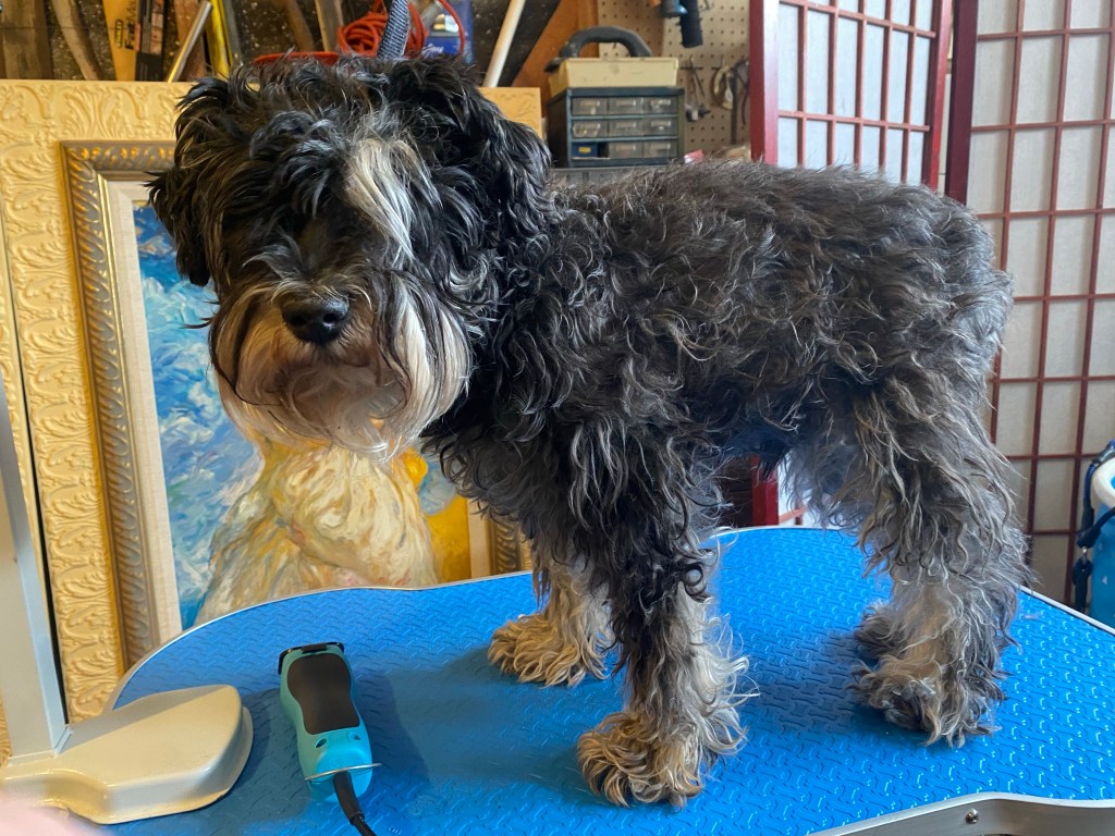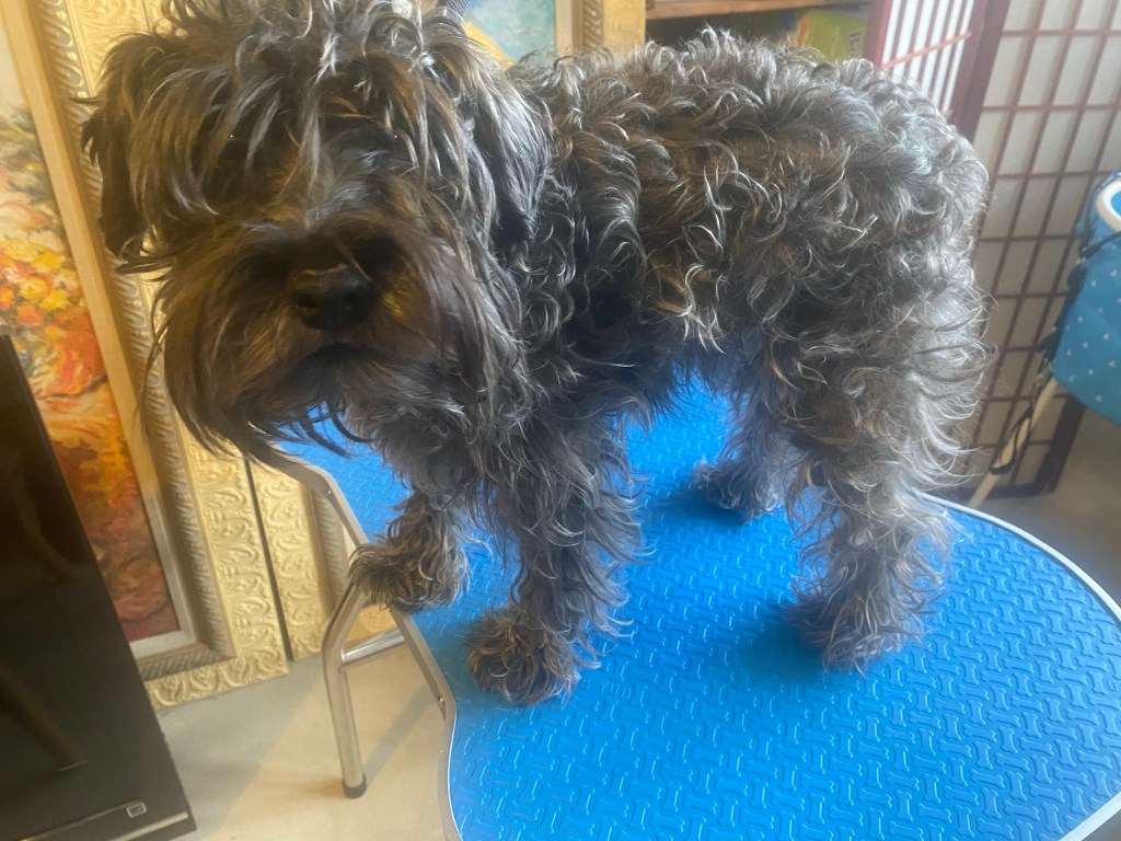 Meet Goofy. He belongs to a good friend of mine. Her family rescued him off the street when he was just a puppy. They think someone drove off to an area without houses and abandoned him. He is still a little nervous about grooming- and especially hates to have his nails trimmed, but he is a good boy. This is probably the fourth time I’ve groomed him, so he has gotten used to me for the most part. I love giving him a clean poodle face. And he looks super cute with the puff on top of his head. He definitely isn’t a full poodle, but based on his coat, I suspect he has poodle in his heritage.