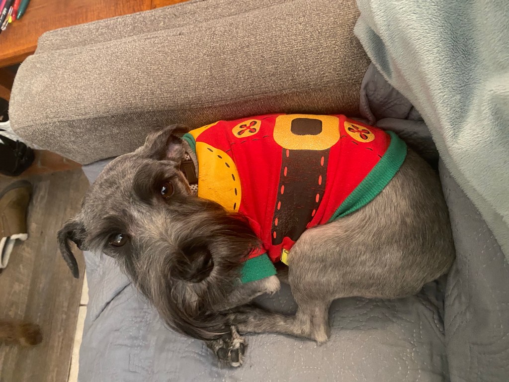 Sweets dislikes being groomed even more than Bags. But I was able to get him cleaned up. Here is his after picture. My mom grabbed an elf shirt she bought for Annie last Christmas. So, now he and Bags match.