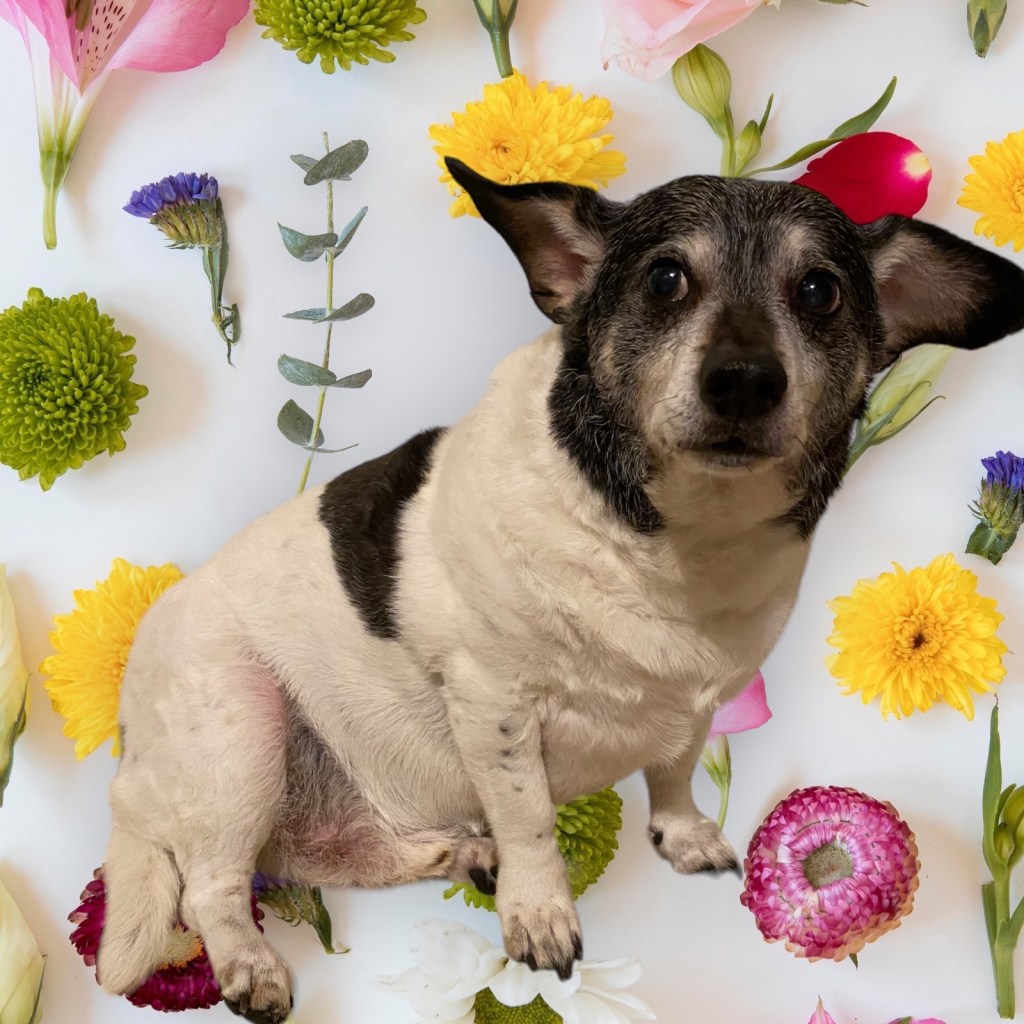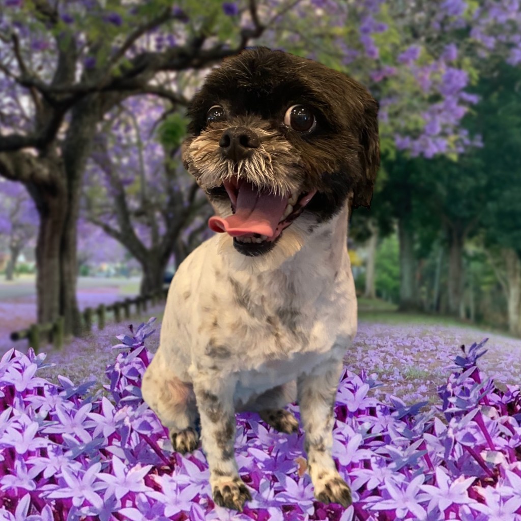 Then, when I groom a dog, I take at least one before picture and several after pictures. I run at least one after pic through an app I have that puts the image of the dog on a fun background. (The app is called Photo Room.) Here are the after pics from my latest appointments: Aasha and Skudz.